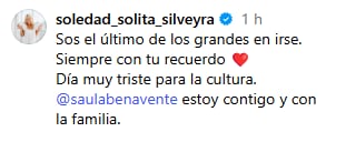 La actriz Soledad Silveyra, quien compartía escenario con Brandoni en la obra ¿Quién es quién?, la última que el actor llevaba adelante antes del incidente doméstico que derivó en su internación, publicó un mensaje en el que expresó su despedida y acompañó a su entorno cercano. “Sos el último de los grandes en irse. Siempre con tu recuerdo. Día muy triste para la cultura”, escribió. En el mismo mensaje, mostró su solidaridad con la pareja y la familia del actor de Esperando la Carroza.